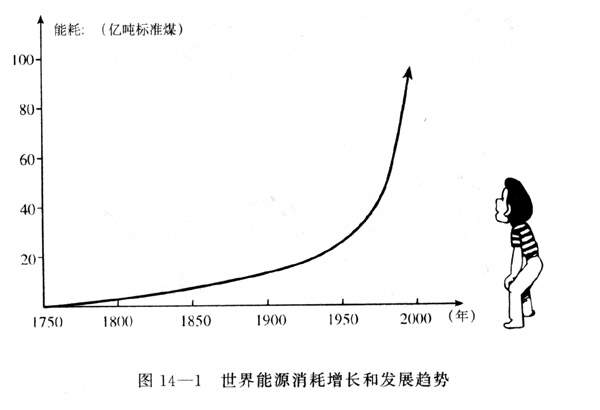 我们从前面的学习中已经看到,各种能源的广泛利用,给人类的物质文明和精神文明带来了巨大进步。而伴随着这种进步,能源的消耗量越来越大。特别是近三四十年来,能耗增长趋势十分明显(图14-1)。如果把全世界的能源消耗量折合成燃烧值为2.93x107焦/千克的标准煤来计算,1950年为26亿吨,1987年为110多亿吨,估计到2000年要超过200亿吨。